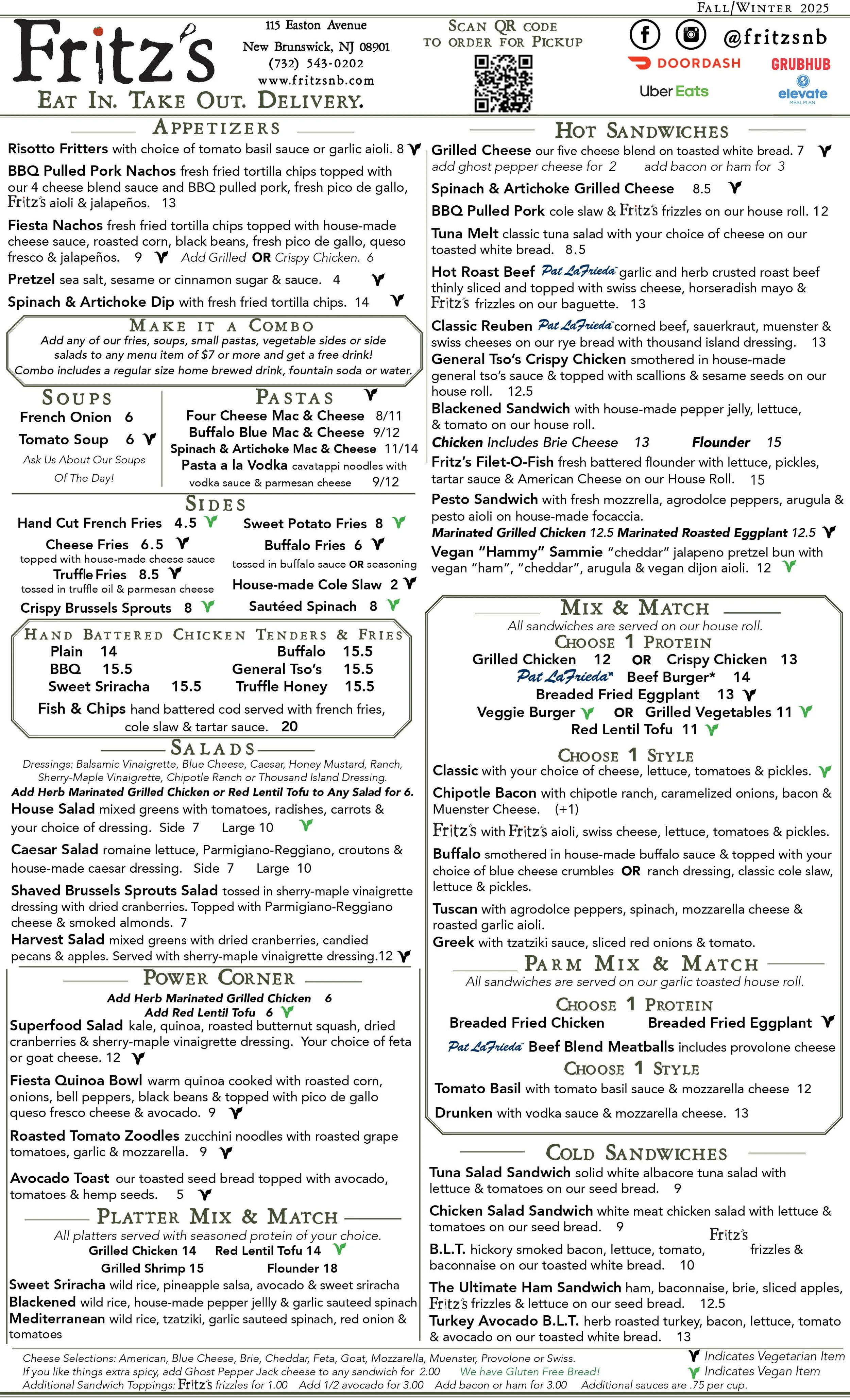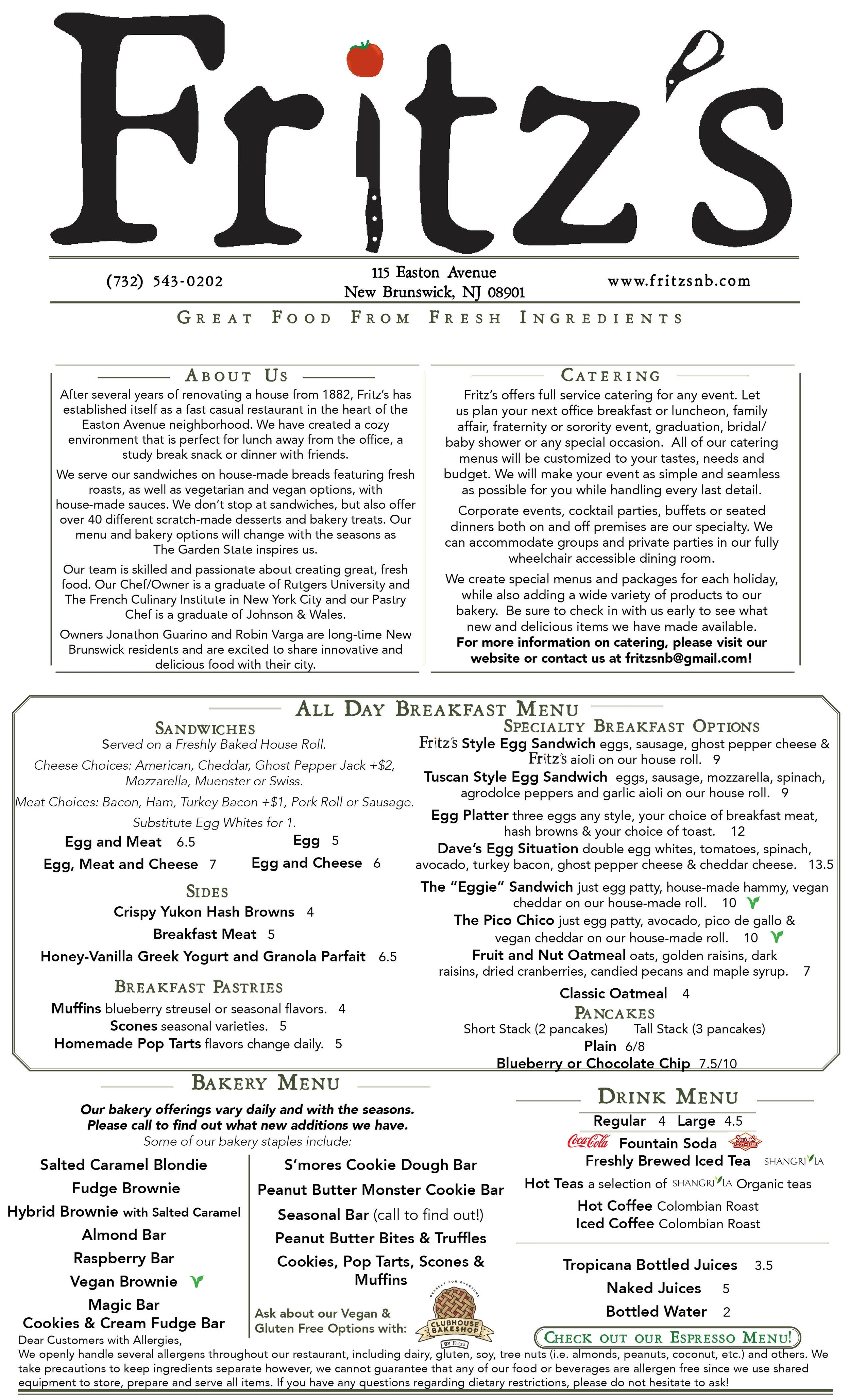 Nestled within a beautifully renovated 1882 house, Fritz's has become a beloved fast-casual dining destination in the heart of the Easton Avenue neighborhood. Whether it's a lunch away from the office, a study break snack, or dinner with friends, our cozy environment sets the perfect scene.
