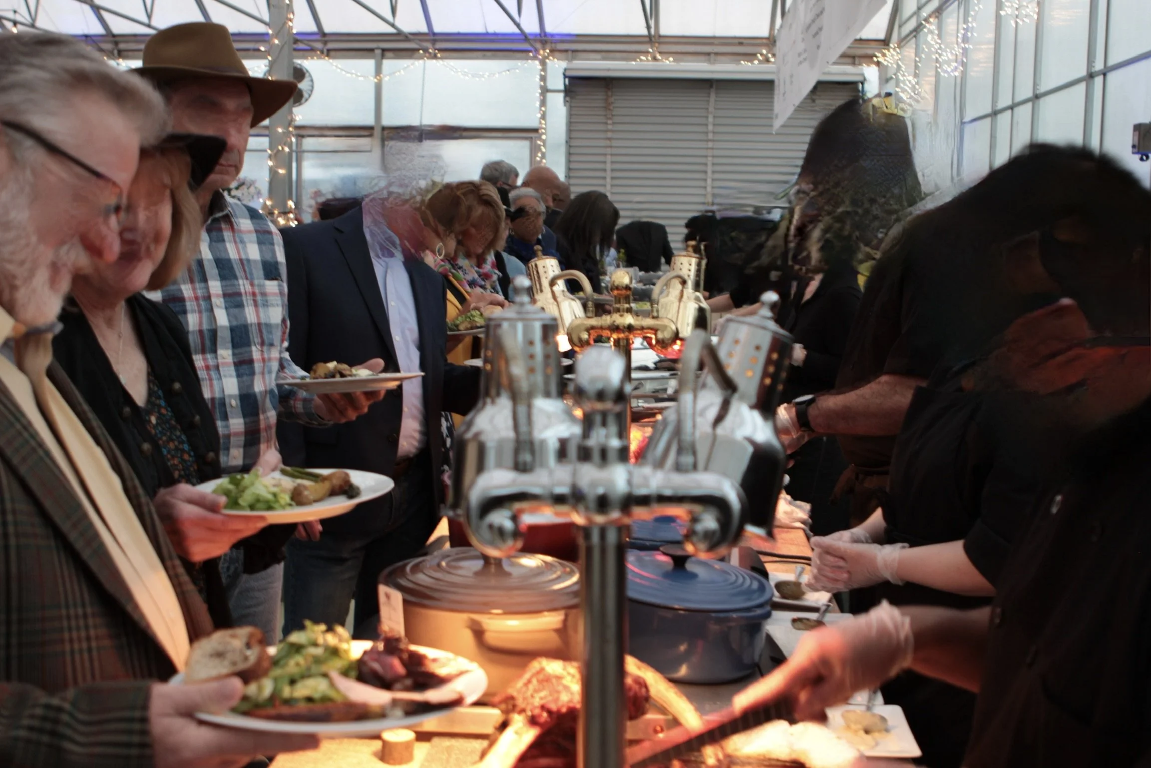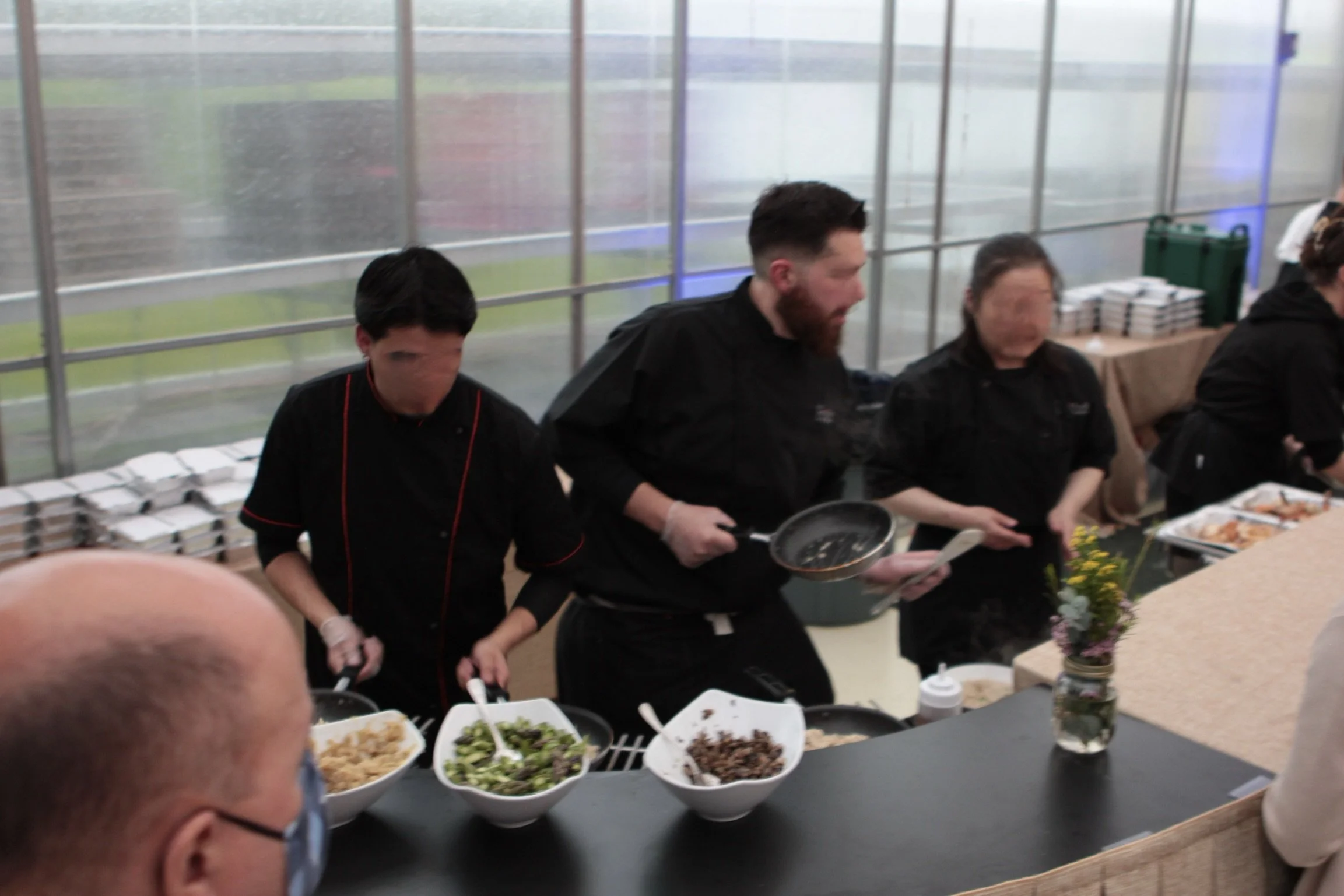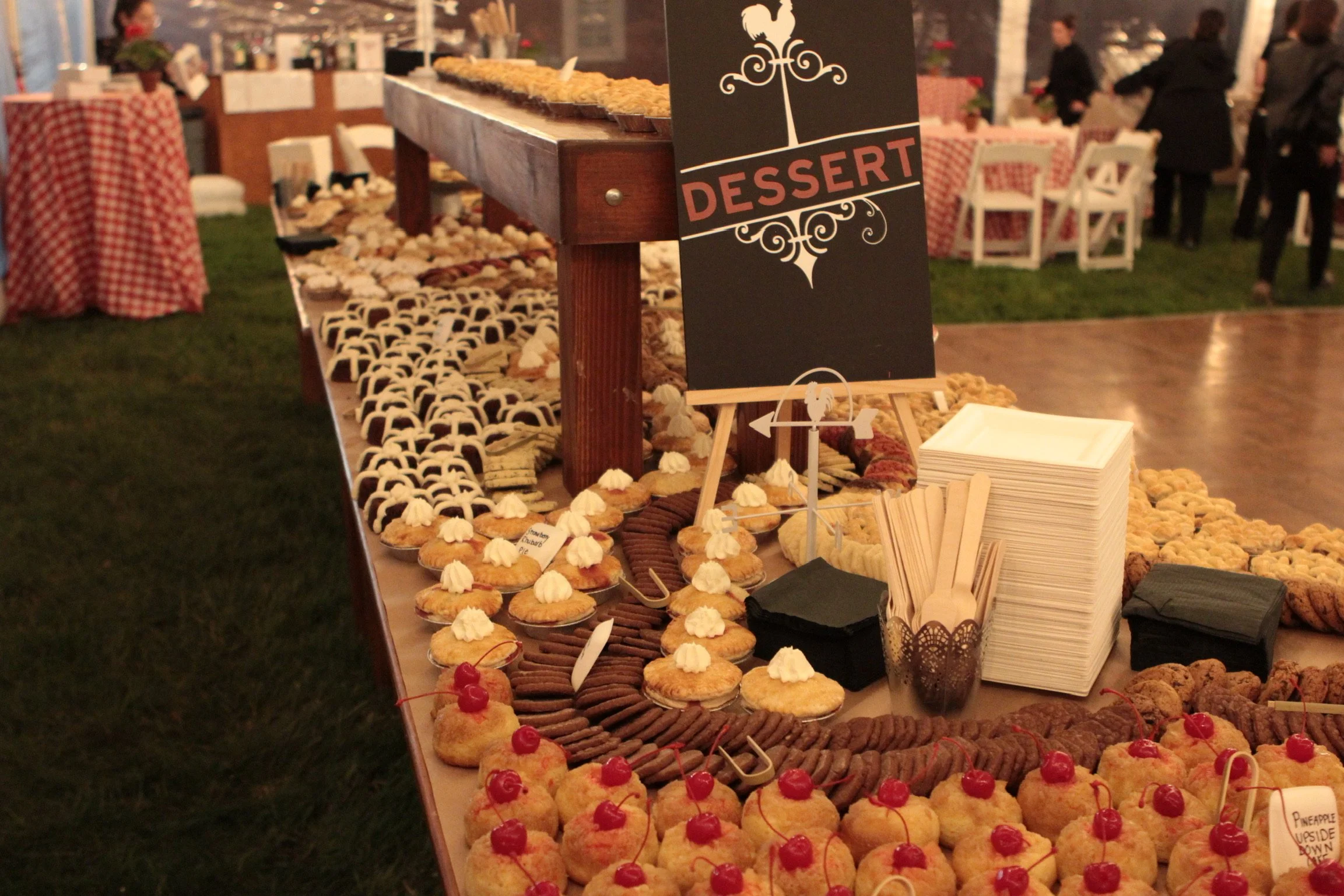 The State Theatre New Jersey held their annual gala at Suydam Farms in 2022. Originally planned as a picturesque journey throughout the historic farm in Somerset, NJ, the event featured cocktail hour food stations scattered across various locations, each accompanied by live music. Following this, a buffet-style dinner, complete with a risotto action station and Tomahawk steak carving station, was set up in the greenhouse. To ensure optimal freshness, all food was prepared onsite using commercial cooking equipment housed in a barn and food tent.