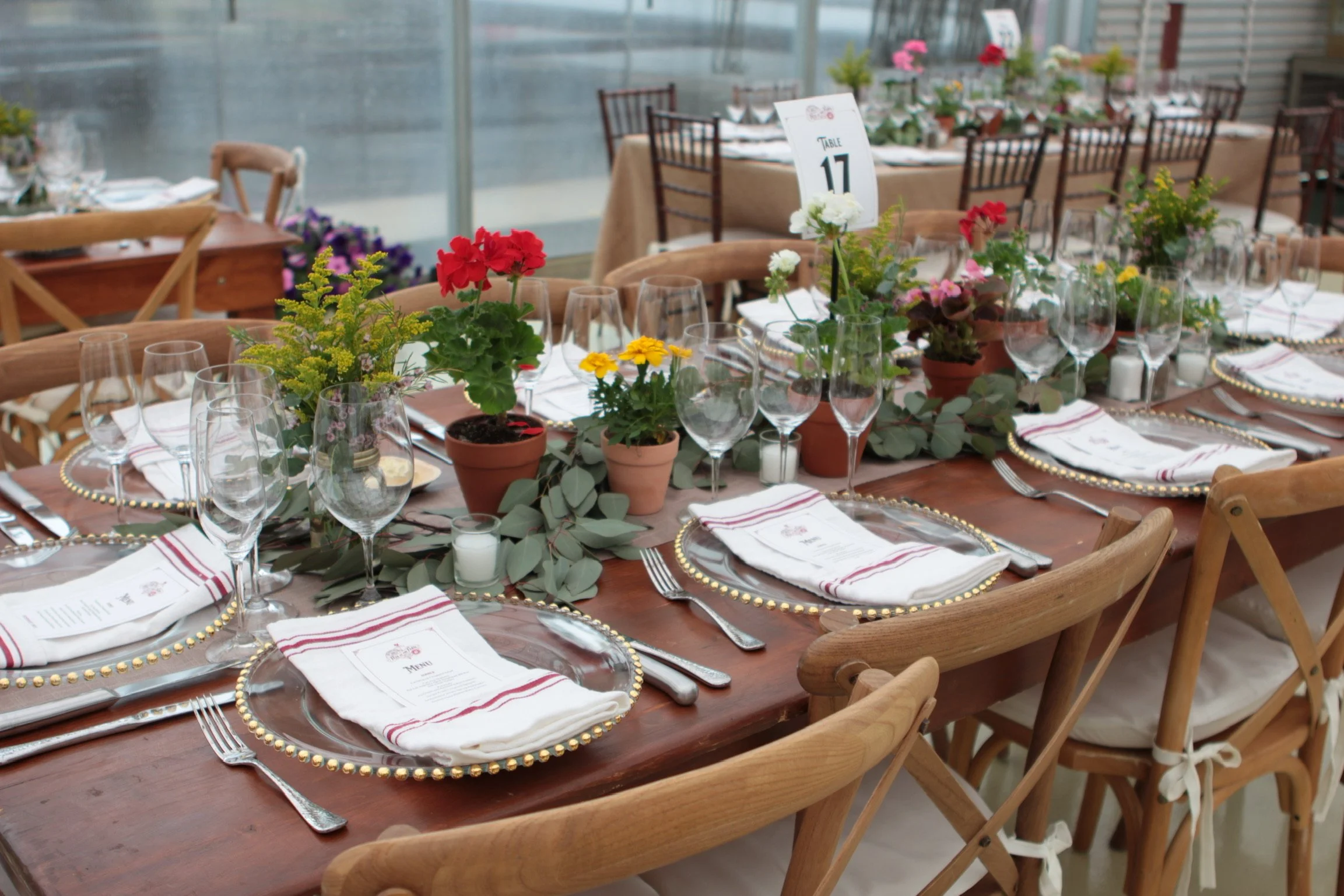 However, Mother Nature had other plans! On this particular day in May 2022, the area experienced record-breaking rainfall and strong winds. Anticipating the weather's unpredictability, we made the decision to relocate the cocktail hour, dessert, and music under a massive tent, while proceeding with dinner in the greenhouse. Despite the challenging conditions, the event proceeded flawlessly, leaving a lasting impression on both guests and staff alike. It was truly an unforgettable experience!